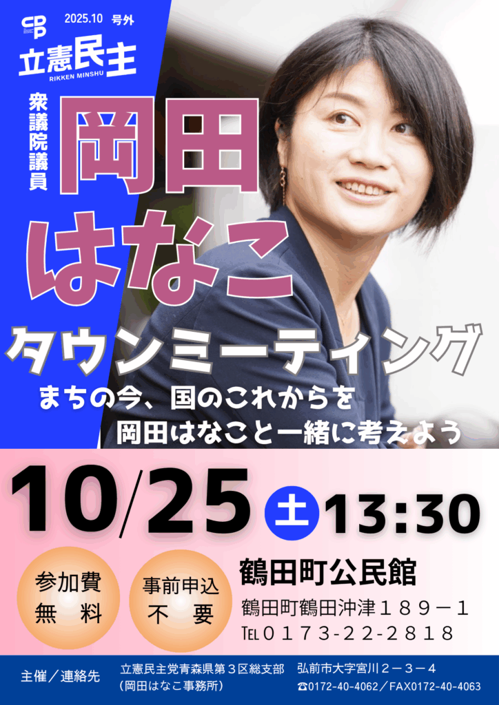 タウンミーティング開催 2025.10.22 活動 10月25日鶴田町公民館にてタウンミーティングを開催します。参加費無料、事前申込不要となっております。奮ってご参加ください。 Post Share 活動レポートVol.3 前の記事 国政報告会を開催します 次の記事